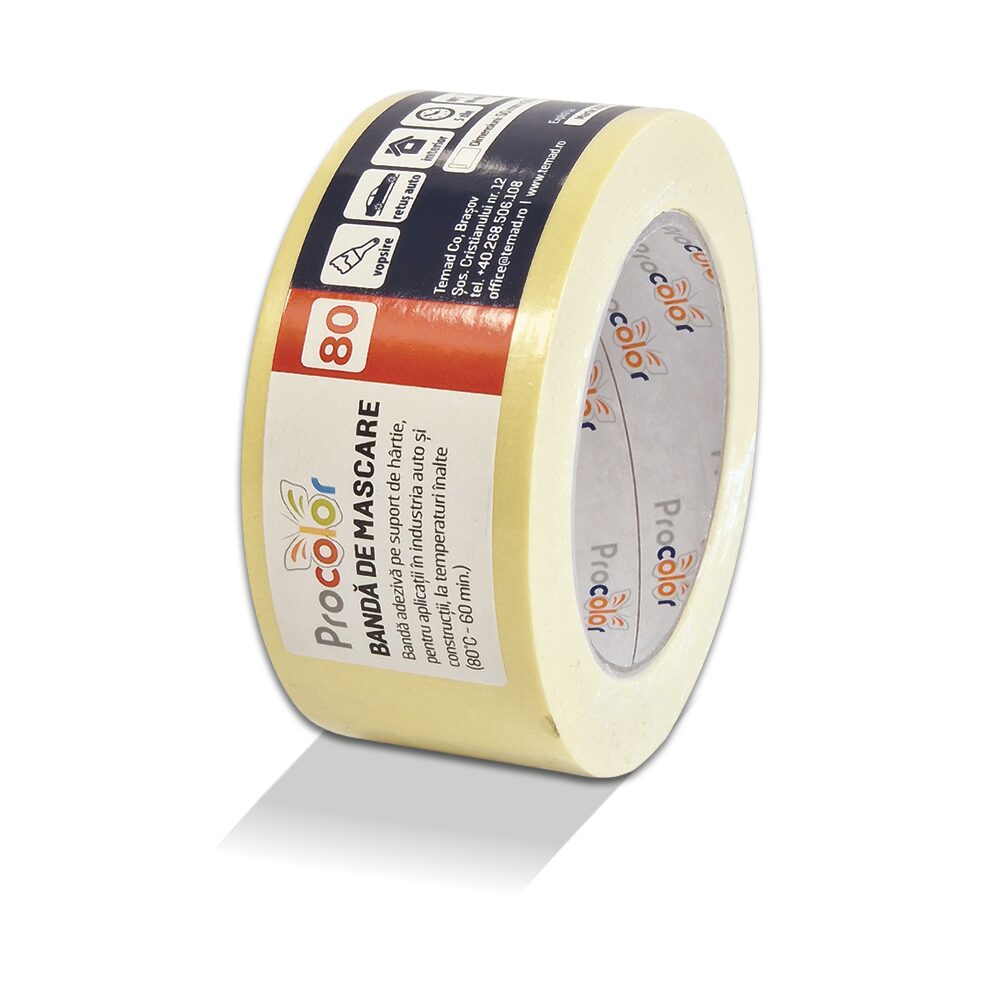 - Suport: hârtie pentru mascare, cu aderență bună la diferite suprafețe, rezistență bună la temperatură și la uzură.