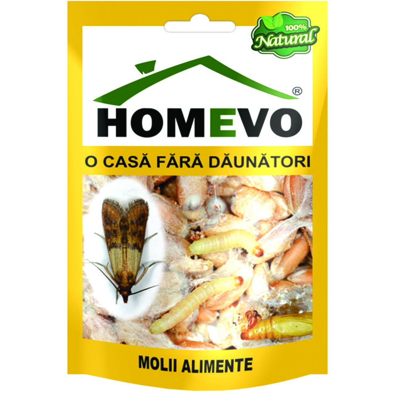 Homevo Molii alimente este impregnat cu un hormon sexual care atrage și capturează toți masculii moliilor din perimetrul înconjurător. Acest mod unic de acțiune ajută la reducerea populației de molii, limitând capacitatea femelelor de a depune ouă viabile. Produsul constă într-o capcană din carton special, impregnată cu un lipici puternic și feromoni atragători pentru molii.