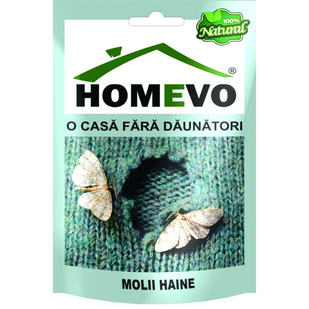 Homevo Molii haine este impregnat cu un hormon sexual care atrage și capturează toți masculii moliilor din perimetrul înconjurător. Acest mod unic de acțiune ajută la reducerea populației de molii, limitând capacitatea femelelor de a depune ouă viabile. Produsul constă într-o capcană din carton special, impregnată cu un lipici puternic și feromoni atragători pentru molii.
