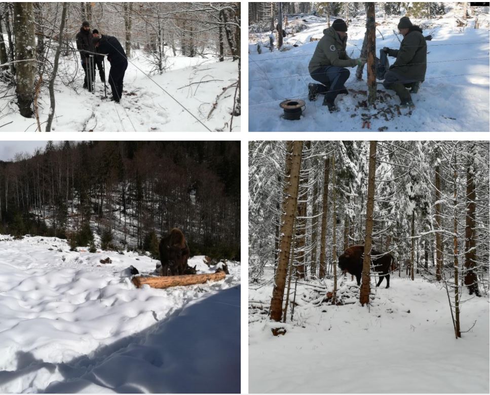 Lucrările avansează la amenajarea incintei pentru zimbri, la Nucșoara. Nu este ușor să construiești în timpul iernii, dar echipa face o treabă excelentă! 70% din gardul electric a fost instalat.