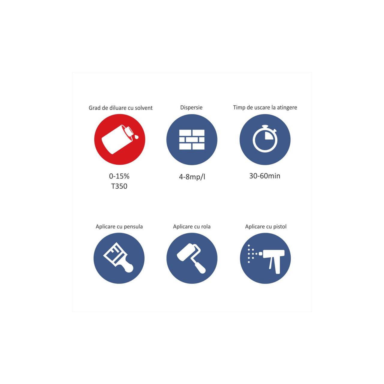 - Este o vopsea anticorozivă durabilă, lucioasă, care se usucă repede, adecvată pentru a fi aplicată fie pe suprafețe metalice ruginite sau vopsite recent sau anterior, fără a fi necesară aplicarea prealabilă a unui grund.