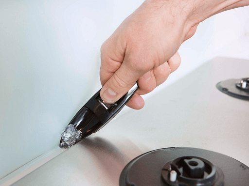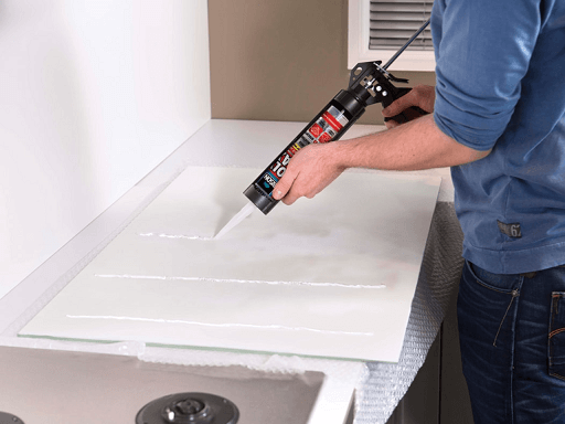 Etanșarea plăcii anti-stropire: Începeți să lucrați dintr-un colț, aplicând BISON Poly Max® High Tack Crystal, poziționând cartușul cu partea oblică a duzei orientată în jos.
