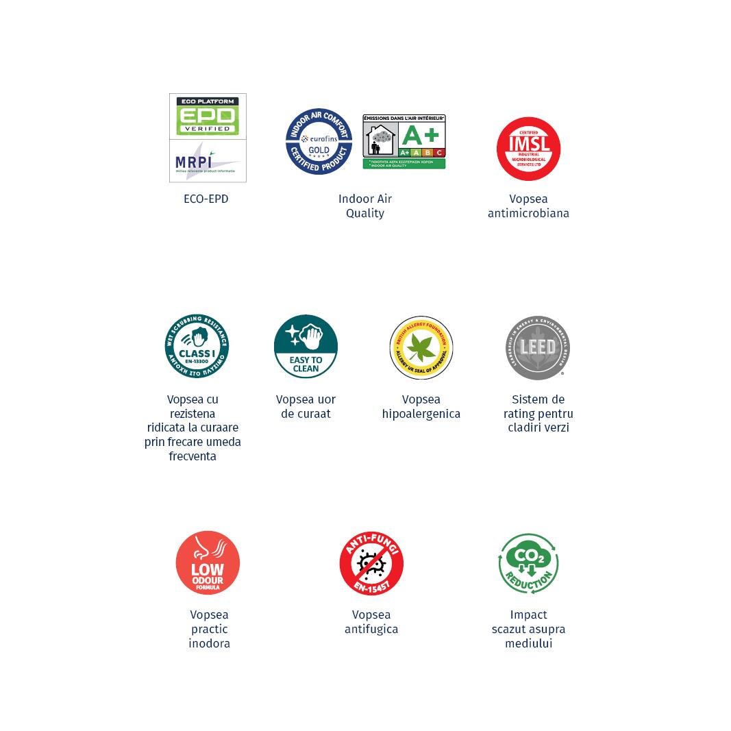 - Prezintă acțiune antimicrobiană în pelicula de vopsea în conformitate cu metodele de testare ISO 22196 și EN 15457.